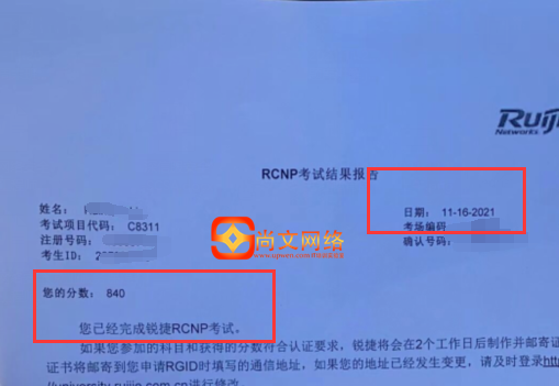 11.16号锐捷RCNP考试通过!840分【尚文网络UPWEN】