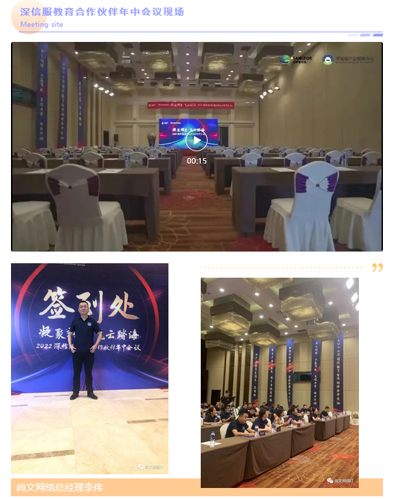 2022年8月20日,“凝聚群星,飞云踏海”2022深信服教育合作伙伴年中会议圆满落幕。深信服科技副总裁李洋、渠道发展部运营专家张昊、河南区渠道主管王鹏、政企合作中心主任徐璐、培训认证中心主任石岩、产教融合中心主任吕沐阳以及河北新龙副总经理刘军池、尚文网络总经理李伟等多位教育合作伙伴代表出席线下会议。