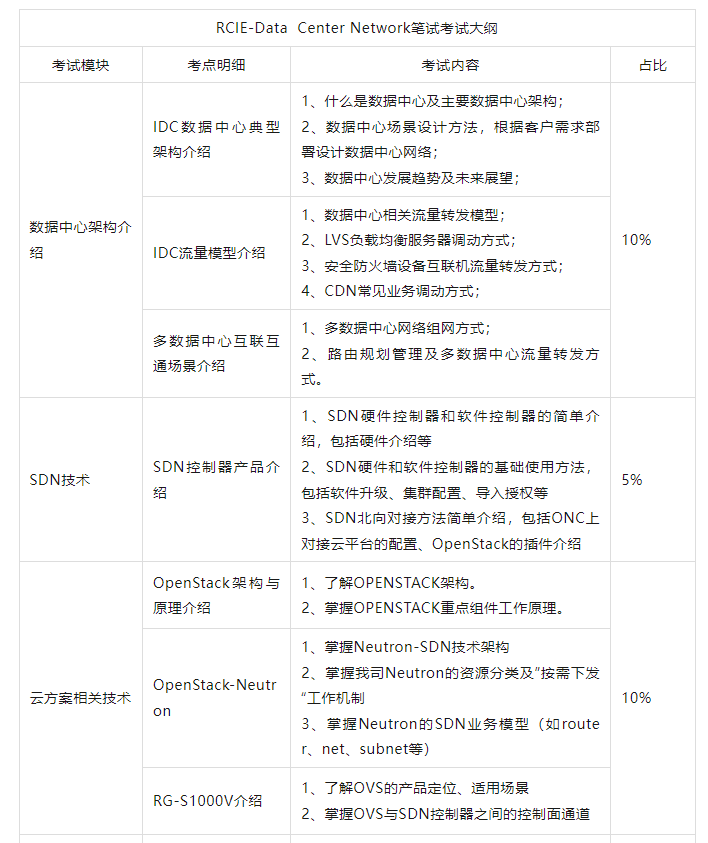 锐捷认证互联网专家-数据中心网络方向RCIE-Data Center Network将于2023年8月11日起正式发布!锐捷认证是以锐捷的产品、技术与资源为平台,来培养 ICT 领域的专业技术人才。锐捷职业认证面向全社会,所有想要了解锐捷相关技术的人员均可以学习并考取。根据 ICT 领域的学习和进阶需求,锐捷认证分为工程师级别 RCNA、高级工程师级别 RCNP 和专家级别 RCIE 三个认证等级。随着信息网络快速发展,行业需要大量的技术专业人才。锐捷网络围绕 IT 人员的培养、从业与发展提供学习服务的落地者。借助锐捷产品、技术与资源,面向行业提供建设方案、人才培养方案、教师培训与实践方案等,以帮助解决网络人才需求。面向客户、渠道合作伙伴和内部的 IT 从业人员提供 IT 技术技能培训、锐捷产品培训和资格认证,以帮助 IT 从业人员提升职业能力。
