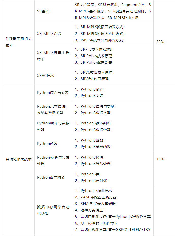 通过《RCIE-Data Center Network》课程培训,证明该认证人员具备以下能力:掌握了BGP、ISIS、SR/SR-MPLS、SR Policy、SRv6、SDN VXLAN等技术;掌握了Python运维自动化等前沿技术;掌握了全面的数据中心网络方案设计能力以及故障排查和解决的能力;