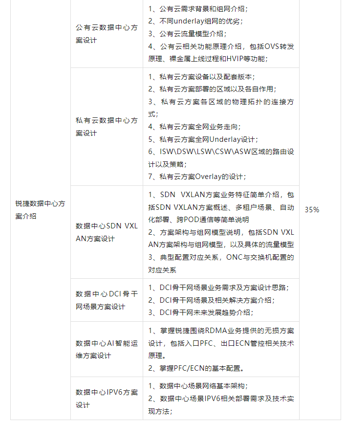 锐捷数据中心方向顶级认证,更深入的技术内容与方案课程,更能证明个人技术水平与价值;更多的方案类课程,快速熟悉锐捷在各个行业数据中心场景中的具体技术与产品细则;增加了Python等目前网络与数据中心中亟需的自动化运维技术课程,获取了前沿网络技术,为后续技术发展奠定基础;