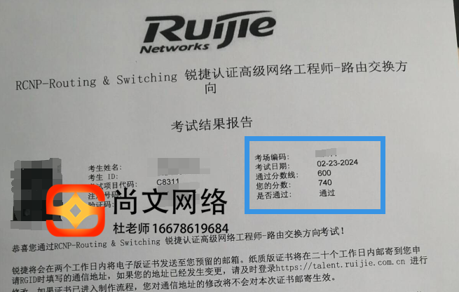 锐捷认证考试RCNP考试通过!恭喜775分