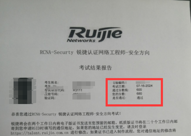 7.16号锐捷安全考试通过,证书到手