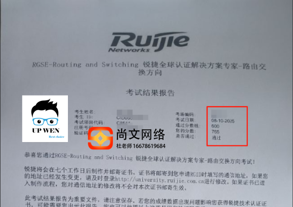 8.10号RGSE专家级网络工程师考试通过!锐捷考试RCIE考试765分