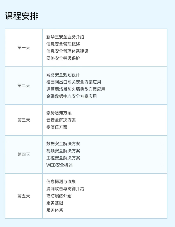 本课程内容涵盖了信息安全管理概述、负载均衡技术及配置、安全方案规划与部署、重点安全技术解决方案、安全攻击与防御技术、安全运营与分析等内容