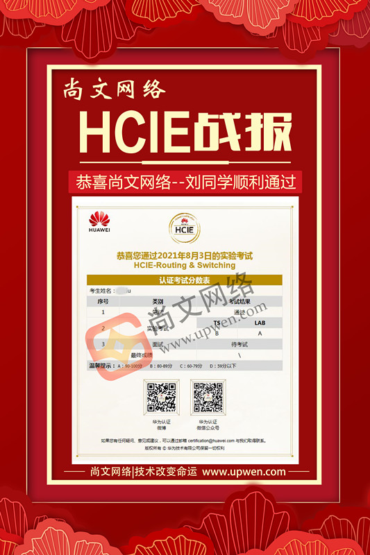 恭喜尚文网络刘学员,顺利通过HCIE考试!+QQ173245796 免费获取学习资源,免费试听