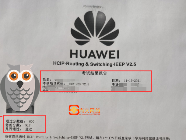 11.17号HCIP考试-223考试通过!917分【尚文网络UPWEN】
