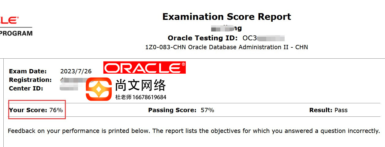ORACLE数据库工程师OCP通过!