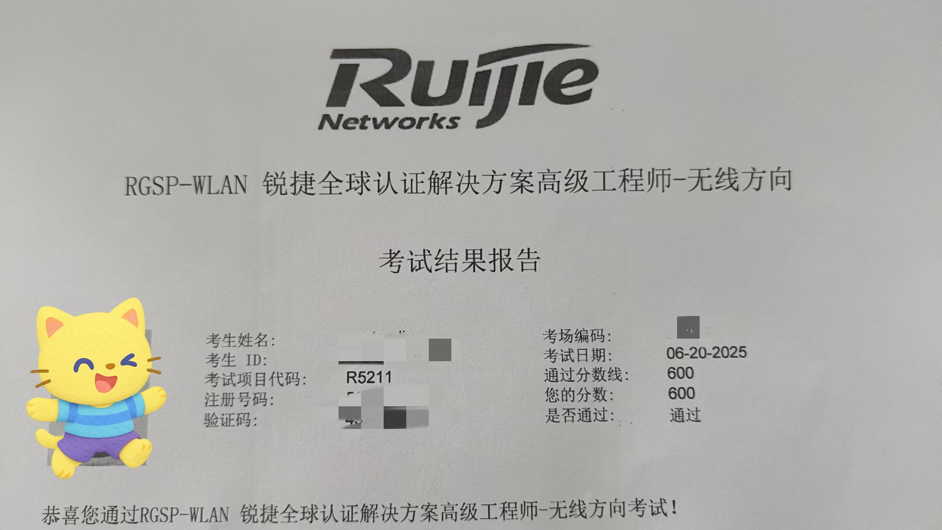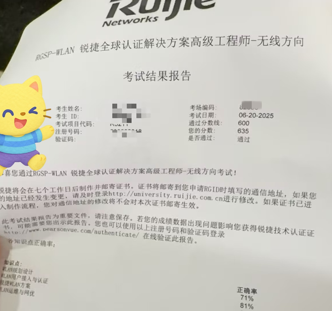 6.20号恭喜锐捷RGSP无线考试通过!!!