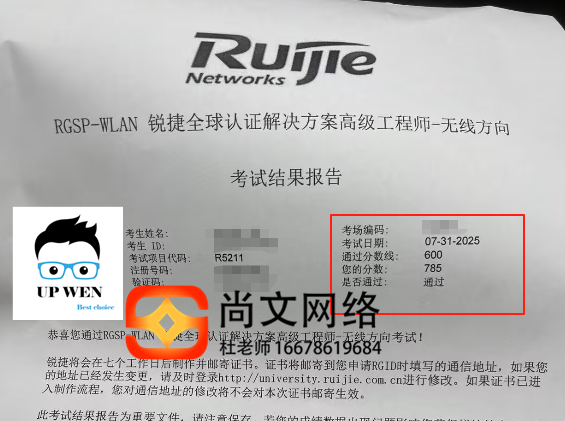 7.31号锐捷RCNP-WLAN无线方向工程师考试通过