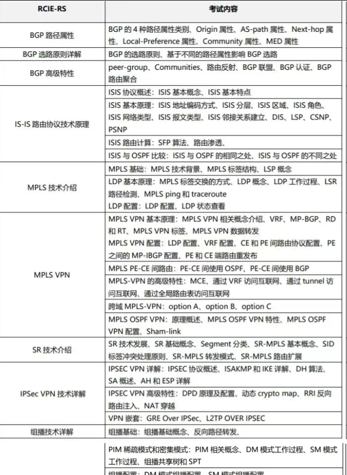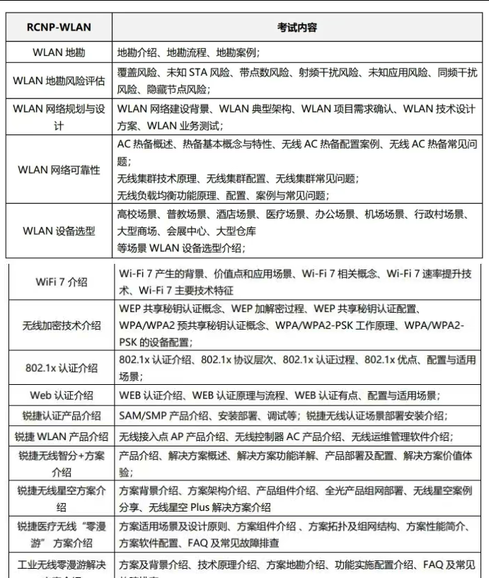 试题范围为锐捷 RCNA-RS(占比 30%)、RCNP-RS(占比 40%)、RCNA-Security (占比 10%)、RCNA-WLAN(占比 10%)、RCNP-WLAN(占比 10%)的知识点。
