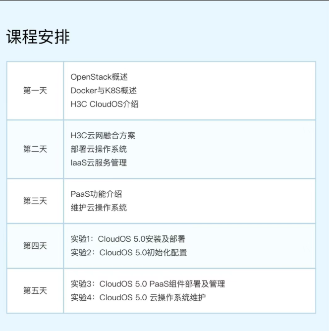 H3C CloudOS云操作系统基于OpenStack平台开发,提供完善的云平台管理及服务;H3C CloudOS云服务兼容CAS、VMware与KVM等多种类型资源池,为用户提供laaS及PaaS云服务H3CSE-Cloud(H3C Certified Senior Engineer for Cloud,H3C认证云计算高级工程师)认证课程可以帮助您了解H3CCloudOS 云服务的技术原理、整体架构,掌握CloudOS5.0的部署、配置及维护技巧,成为H3C认证的云计算高级工程师。